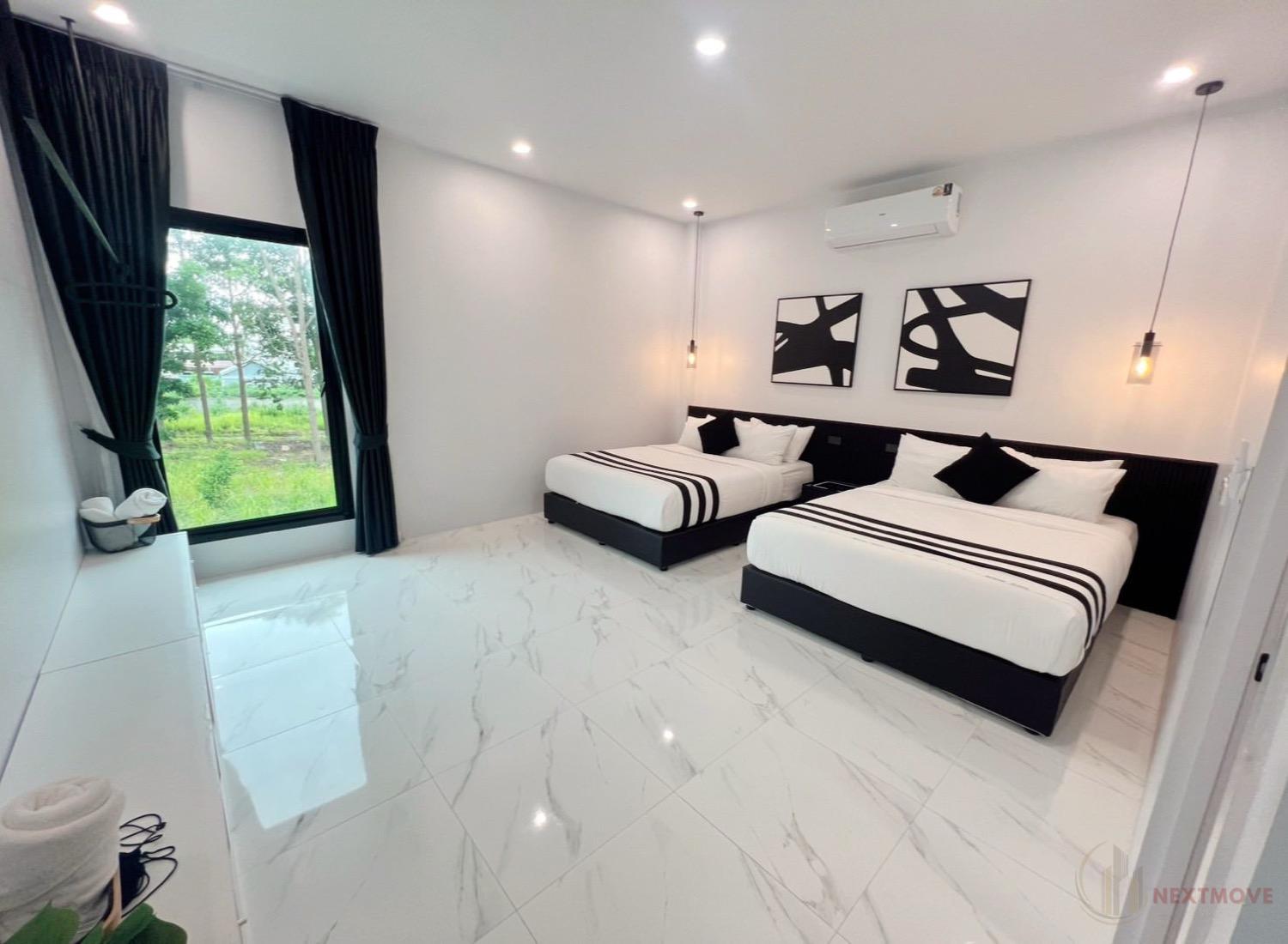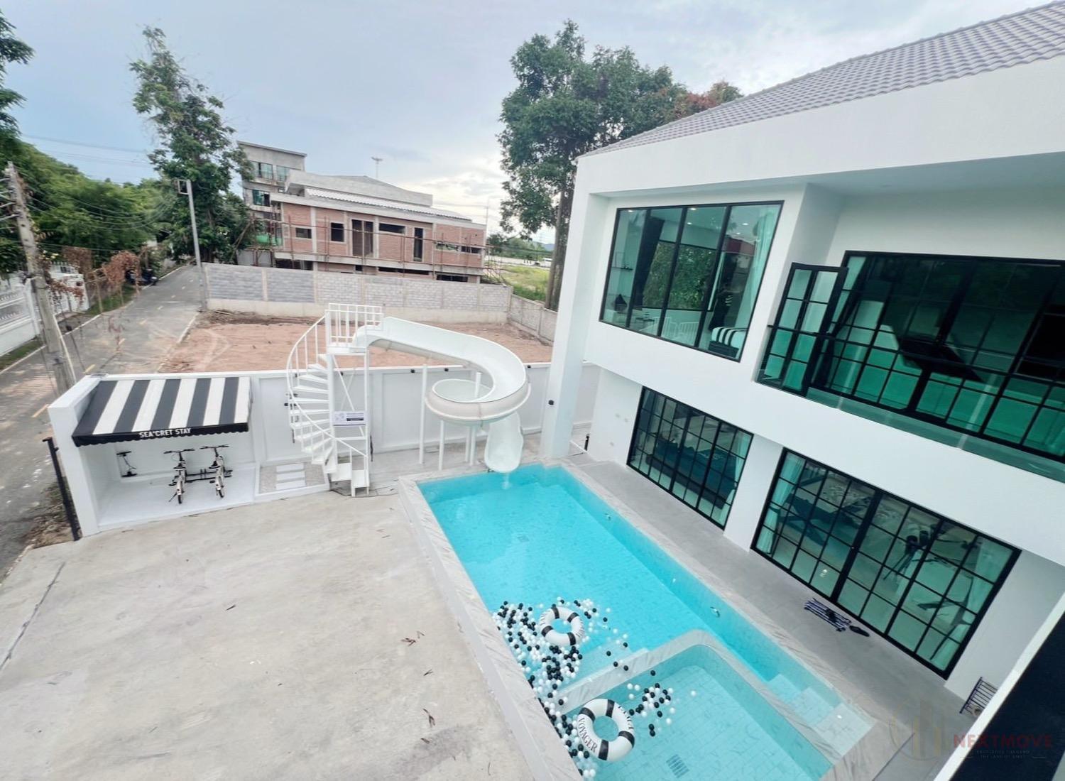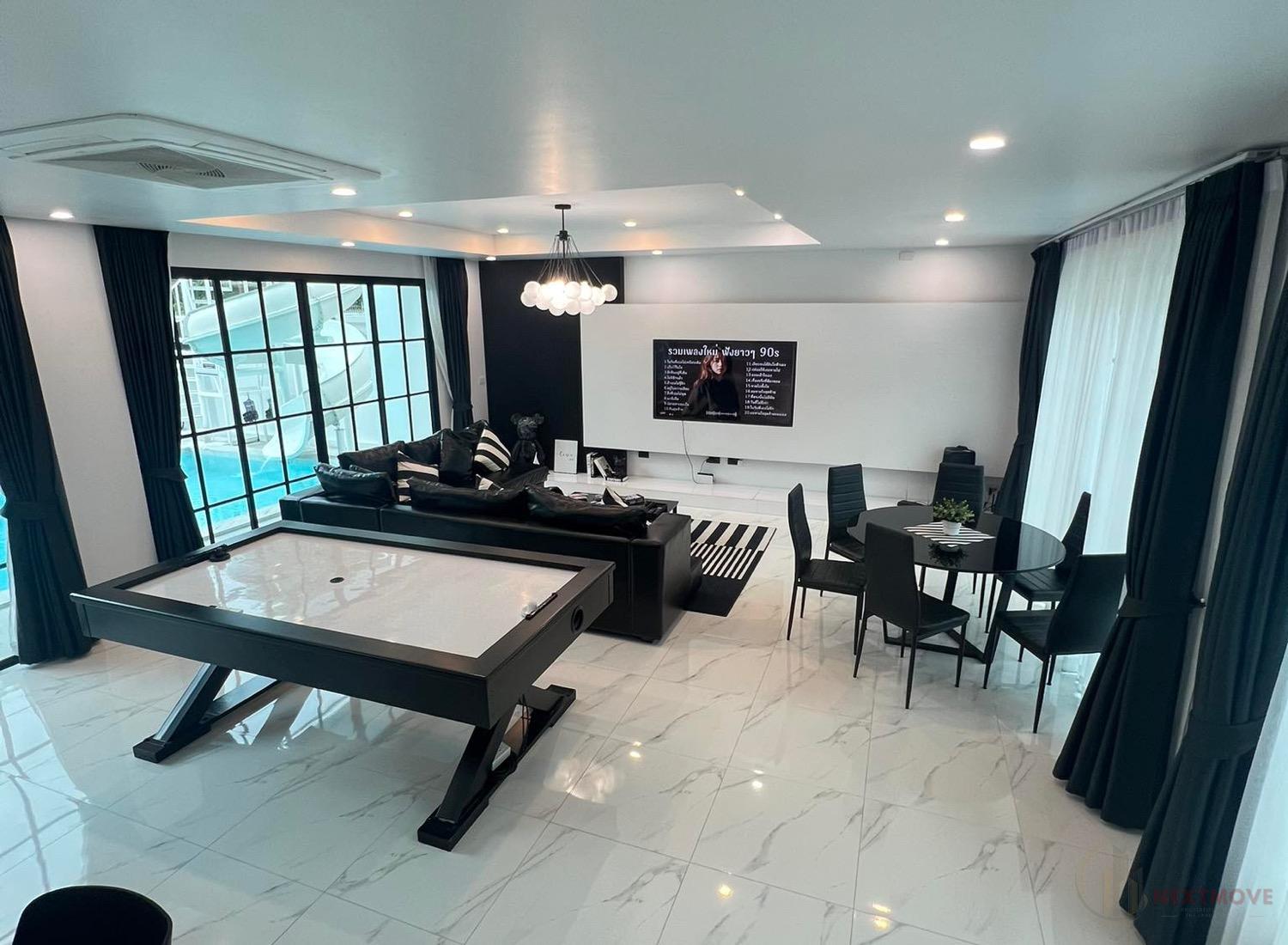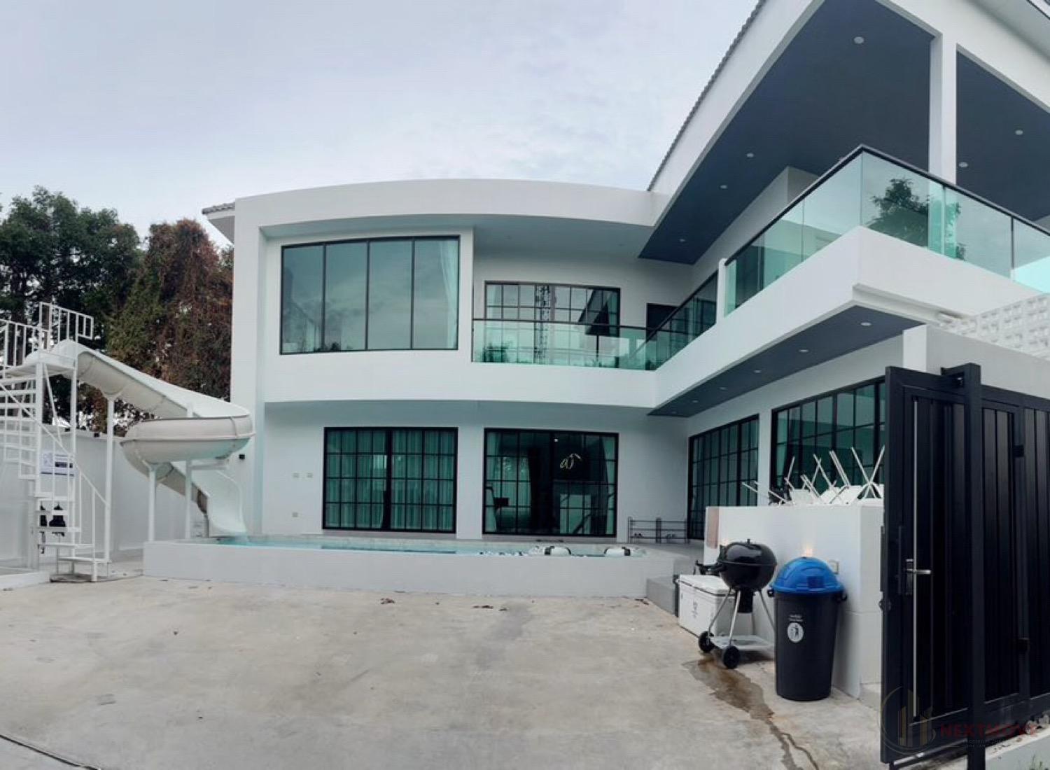 Set within a quiet lane just steps from Sukhumvit and a short stroll to sandy Na Jomtien beach, this contemporary pool villa blends seaside living with city access. The residence offers six bedrooms and seven bathrooms—the ground-floor suite easily converts into a children’s playroom—plus a built-in European kitchen, bathtub, and an airy upper-level balcony with a sea glimpse. A private swimming pool and shaded drive accommodate relaxed outdoor life, while covered parking keeps vehicles secure. Sold with a long-term tenant already in place, it provides steady rental income for the next owner.